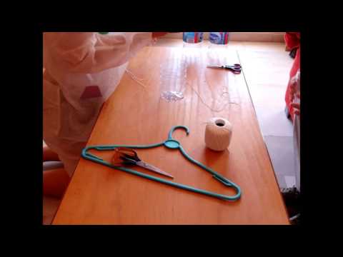 Una percha, cordón ( o hilo, lana o cuerda) y dos vasos de plástico (o culos de botella o envases desechables iguales)